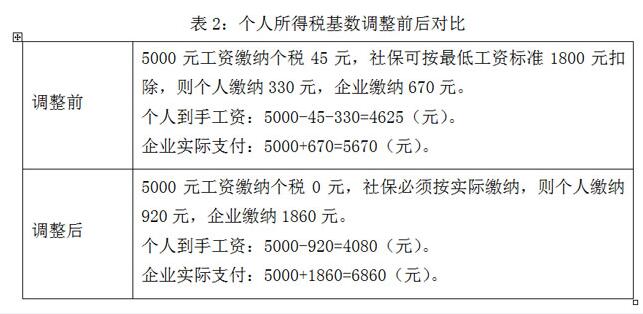 對(duì)比結(jié)論:上調(diào)個(gè)稅基數(shù)后,個(gè)人實(shí)際收入減少,4080元<4625元;企業(yè)實(shí)際負(fù)擔(dān)增加,6860元>5670元。